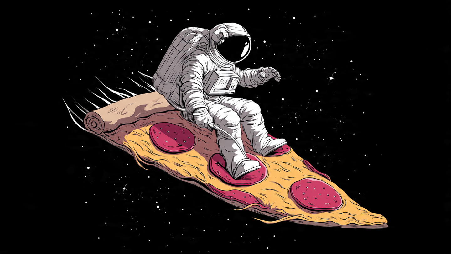 Aí resolvemos testar coisas mais criativas. Pedimos “um astronauta surfando numa pizza gigante no espaço”. E sabe o que aconteceu? A Meta AI criou exatamente isso. O astronauta estava na prancha, a pizza parecia deliciosa mesmo flutuando no espaço, e havia estrelas ao fundo. Confira a imagem de 2 resultados com estilos diferentes: